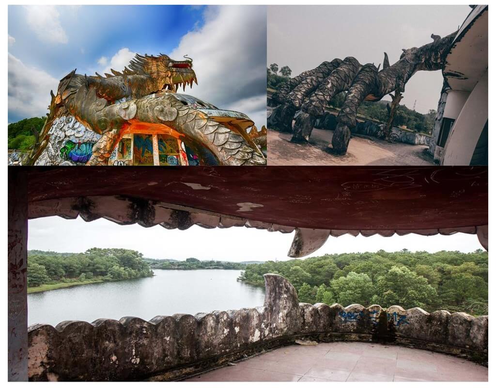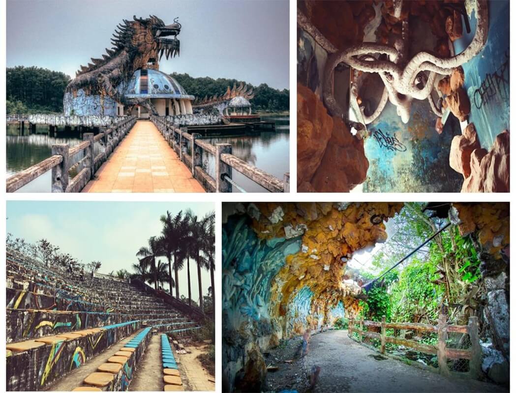 Thủy cung từng được xây dựng công phu giờ trở nên đổ nát, bám rêu bụi, trần nhà vỡ toang hoác thành từng mảnh lớn, lộ cả phần sắt thép và dây điện ra ngoài. Các bức tường loang lổ, đầy những nét vẽ, tạo khung cảnh hoang vu. Thu hút nhất có lẽ là đầu rồng, nhìn từ đây, Hồ Thủy Tiên mang một vẻ đẹp vữa lãng mạn vừa bí hiểm.